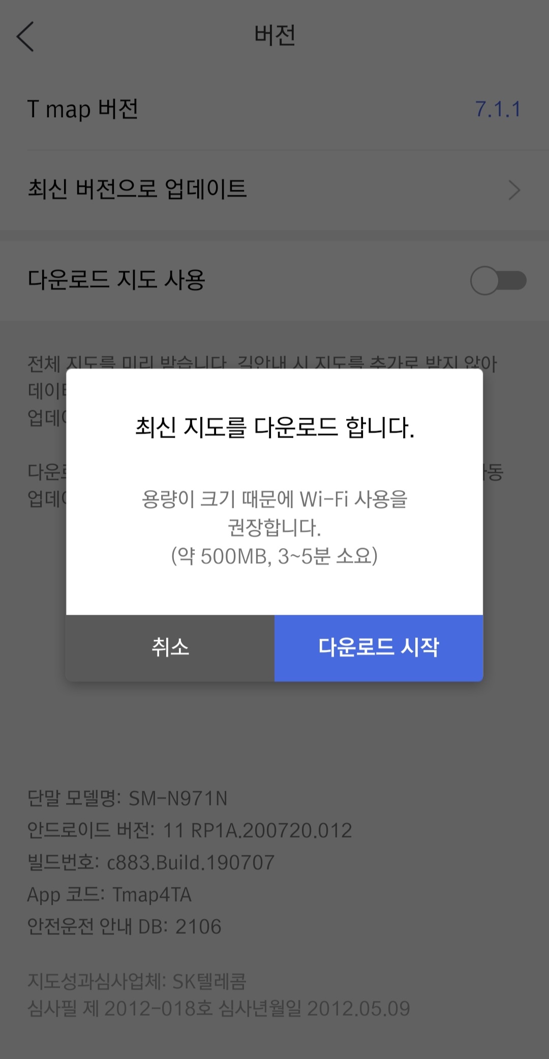 최신 지도를 다운로드합니다.라는 화면이 뜹니다. 다운로드 시작 눌러 주시면 됩니다. 이때 꼭 와이파이 되는 곳에서 사용하세요. 데이터 절약하려고 하다 자칫 데이터 더 쓰는 불 상사가 발생할 수 도 있어요. 꼭 와이파이 되는 곳에서 하세요.