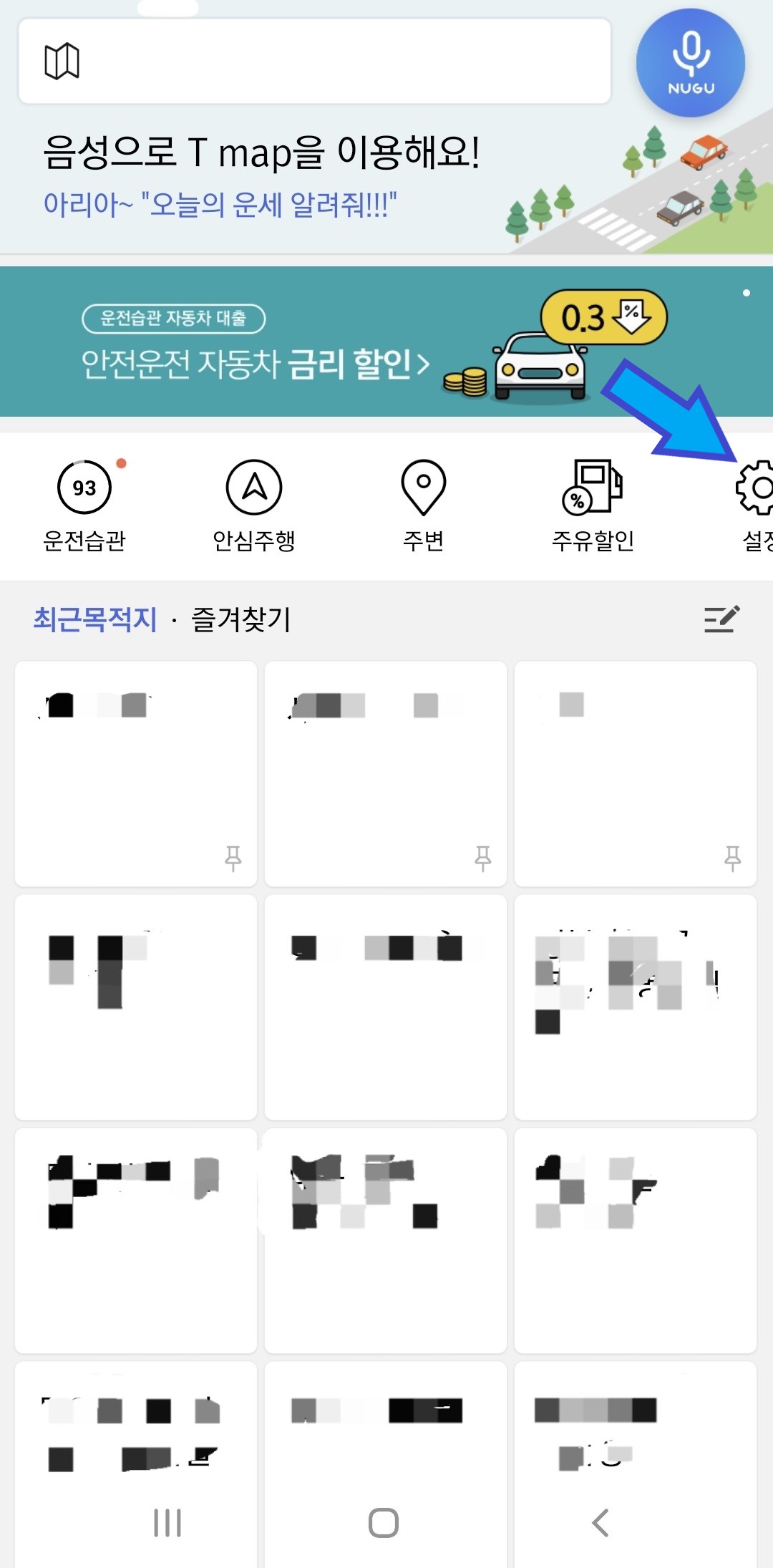 티맵 어플을 실행하면 위 와 같은 화면이 나오는 데요. 파란색으로 표시해둔 톱니바퀴 모양의 설정을 누르세요.