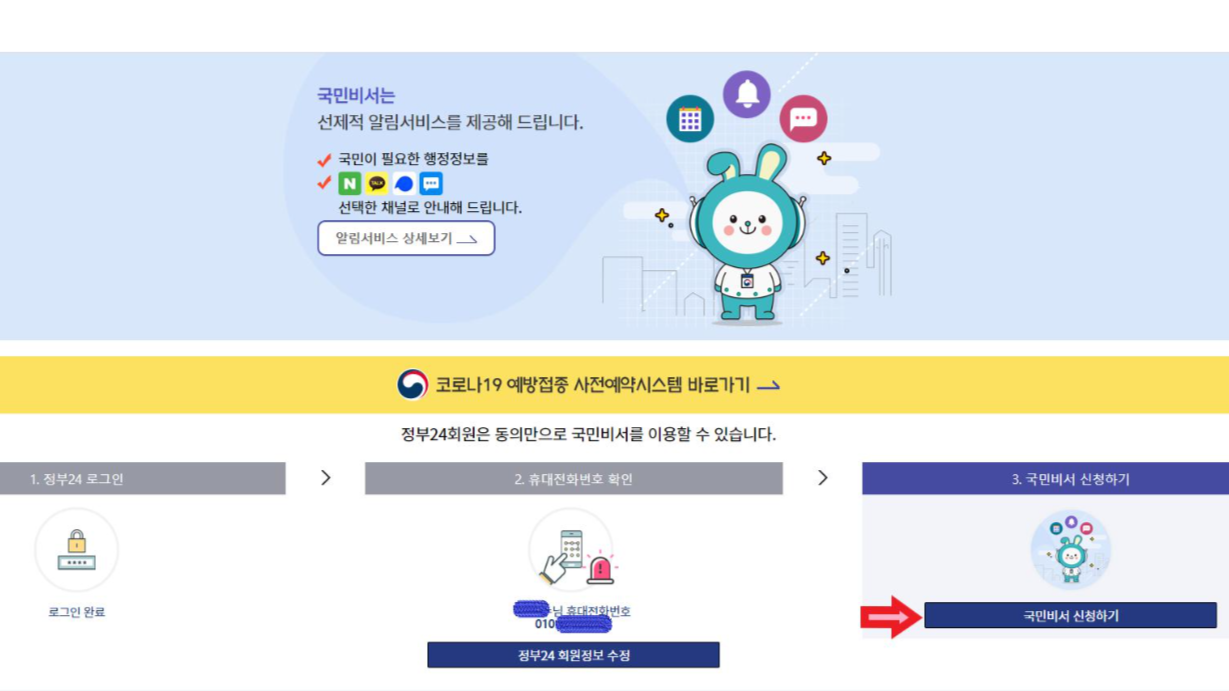 위 화면은 인터넷 정부24 홈페이지 화면입니다. 하단에 붉은색 화살표가 가리키는 국민 비서 구삐 서비스 신청을 클릭하시면 됩니다.