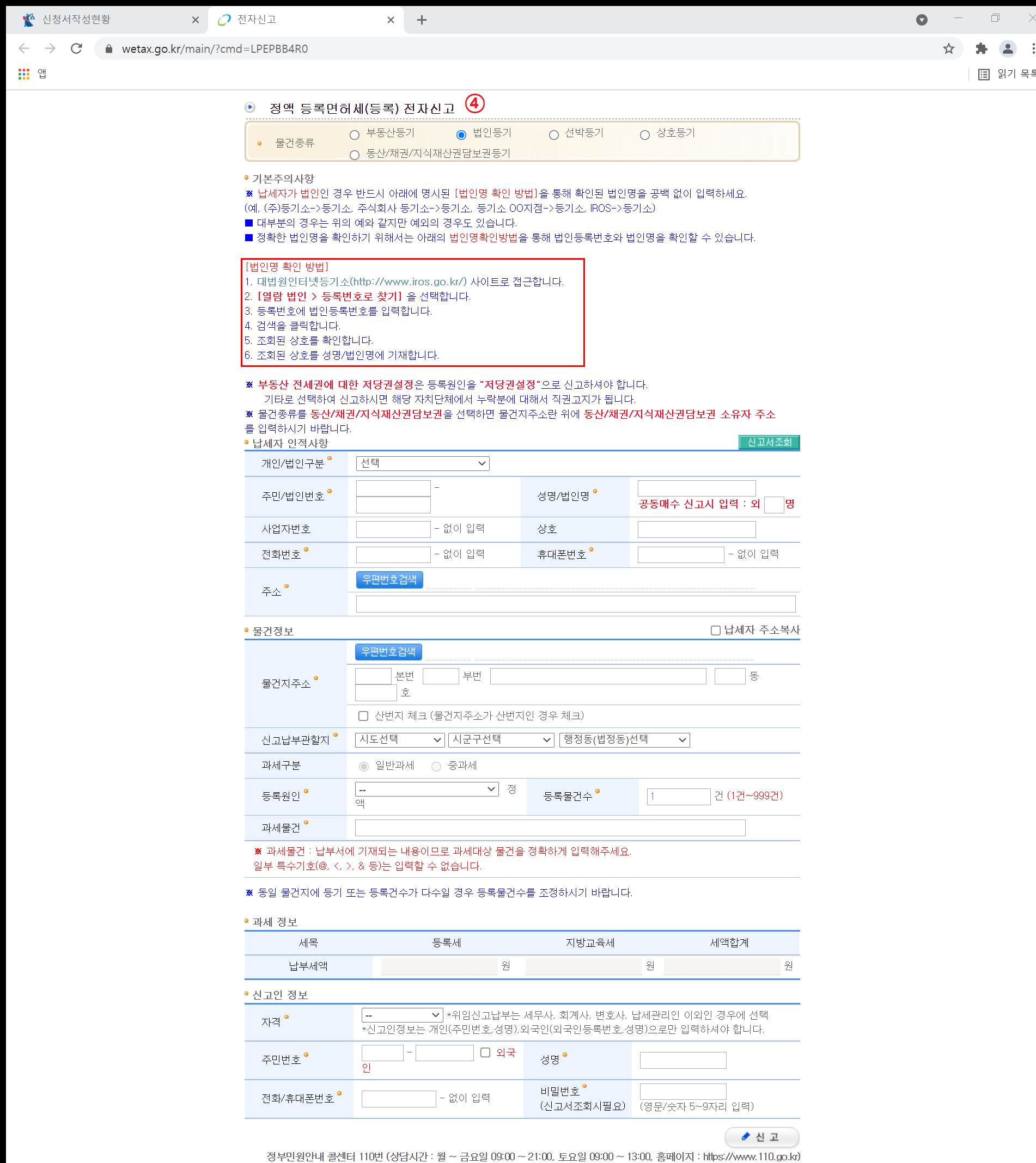 신고서가 열리면 꼭 기본주의 사항부터 천천히 읽어보시고 아래의 빈칸을 채운 후 신고합니다.
