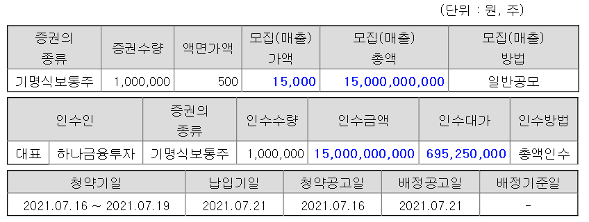 청약 기일은 21년 07월 16~21년 07월 19일까지 이며 일반투자자는 하나금융투자 본. 지점에서 청약 가능합니다.