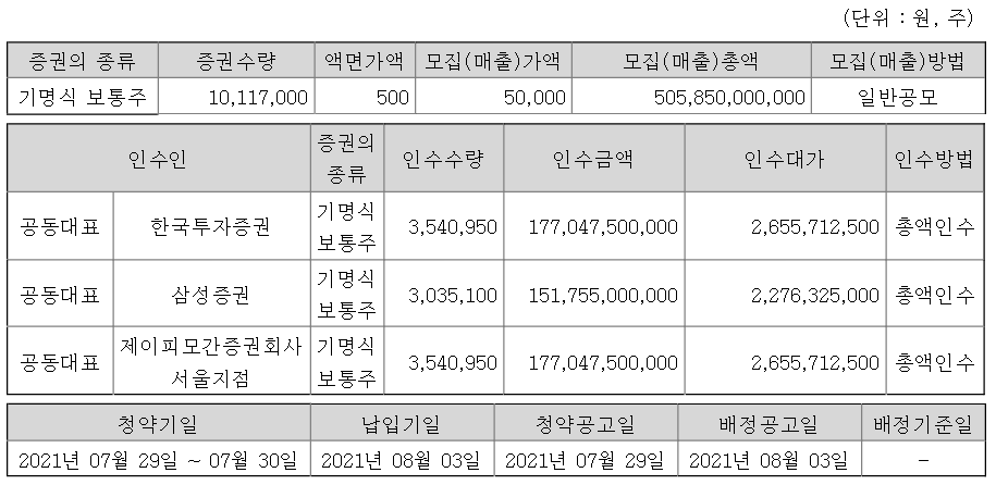 청약 기일은 21년 07월 29일~21년 07월 30일까지 이며 일반투자자는 한국투자증권, 삼성증권 본. 지점에서 청약 가능합니다.
