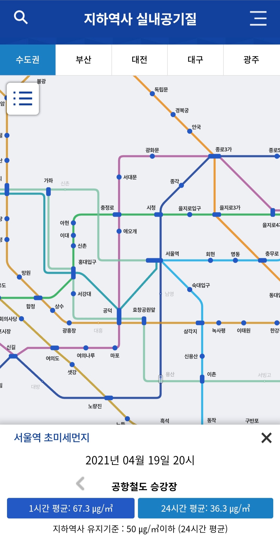 이렇듯 내가 이용하는 지하역사의 초미세먼지 농도를 간단하게 출퇴근 시간에 확인할 수 있어요. 너무 간편하고 좋은 것 같습니다.