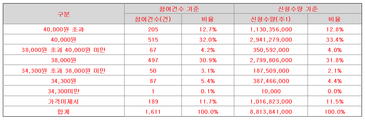 일진하이솔루스의 기관 참여율이 높고 40,000원 이상 제시한곳이 참여건수 대비 약 45% 정도나 됩니다.