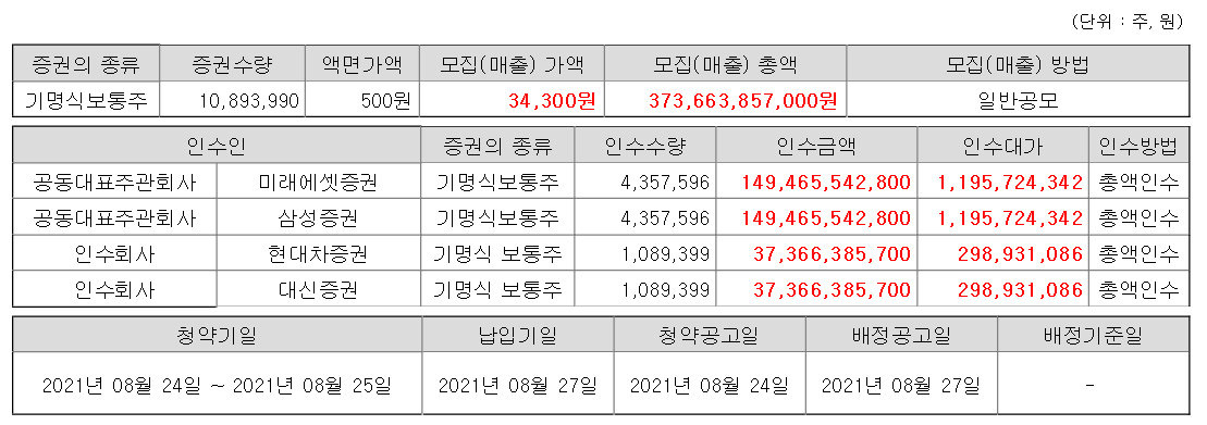 - 공모청약일 : 2021년 08월 24일~08월 25일