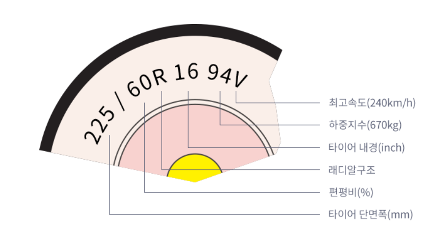 [타이어 단면폭이 225mm][편평비60%][레디얼구조][타이어내경16인치][하중지수94(최대670kg)][최고속도V(210km/h)]