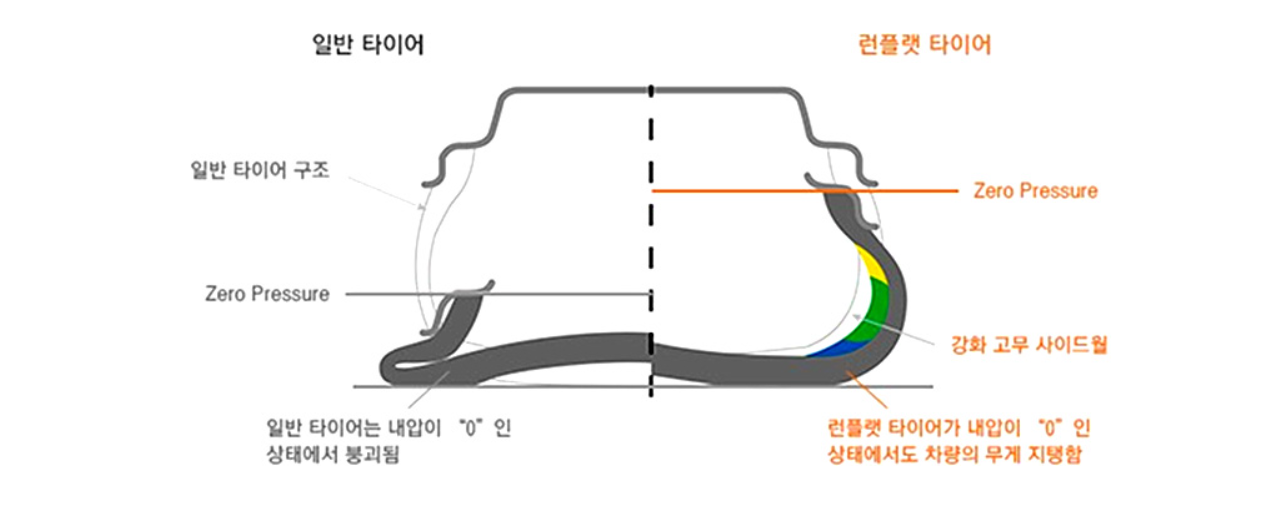 주행 중 손상에 의해 타이어가 펑크가 나거나 바람이 빠져 타이어 내의 공기압이 없어도 80km/hr의 속도로 일정 거리 주행이 가능하도록 설계된 타이어입니다.