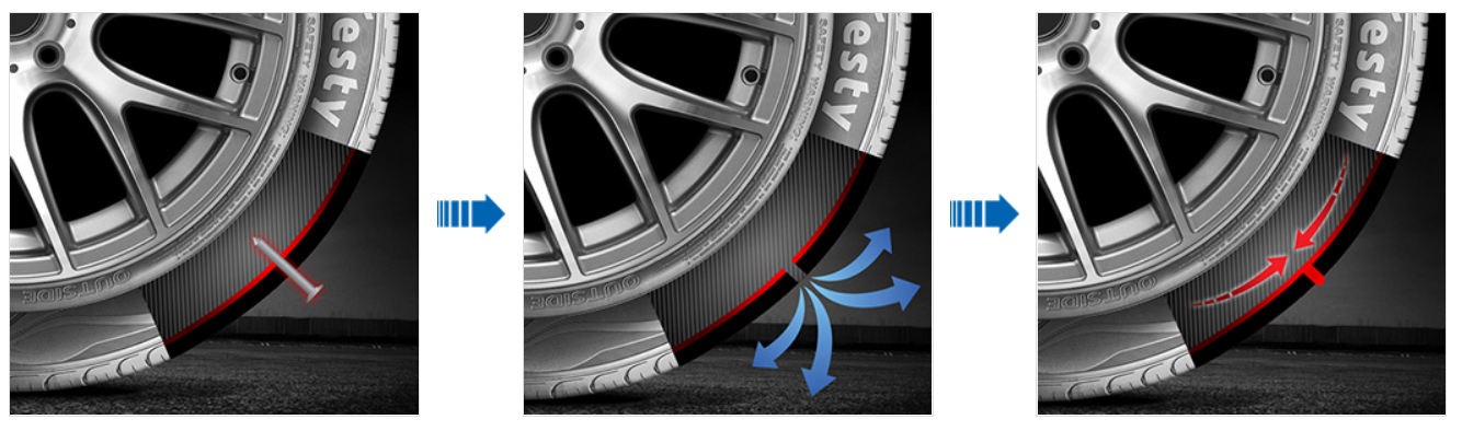 못 같은 이물질이 관통하여 트레드 부위가 손상 되었을때, 주입된 공기가 새어나가는 것을 방지하기 위해 타이어 내부에 실런트를 도포한 타이어입니다.