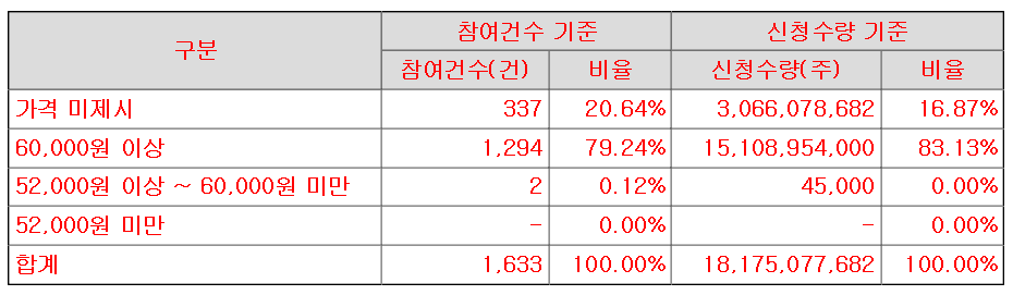 한국조선해양에서 분할 전 이름이 현대중공업으로 많은 분들에게 이미 익숙한 이름에 걸맞게 수요예측 인기도 뜨겁고 공모가 최상단인 60,000원 이상 제시한 기관이 거의 다라고 보시면 될 듯합니다.