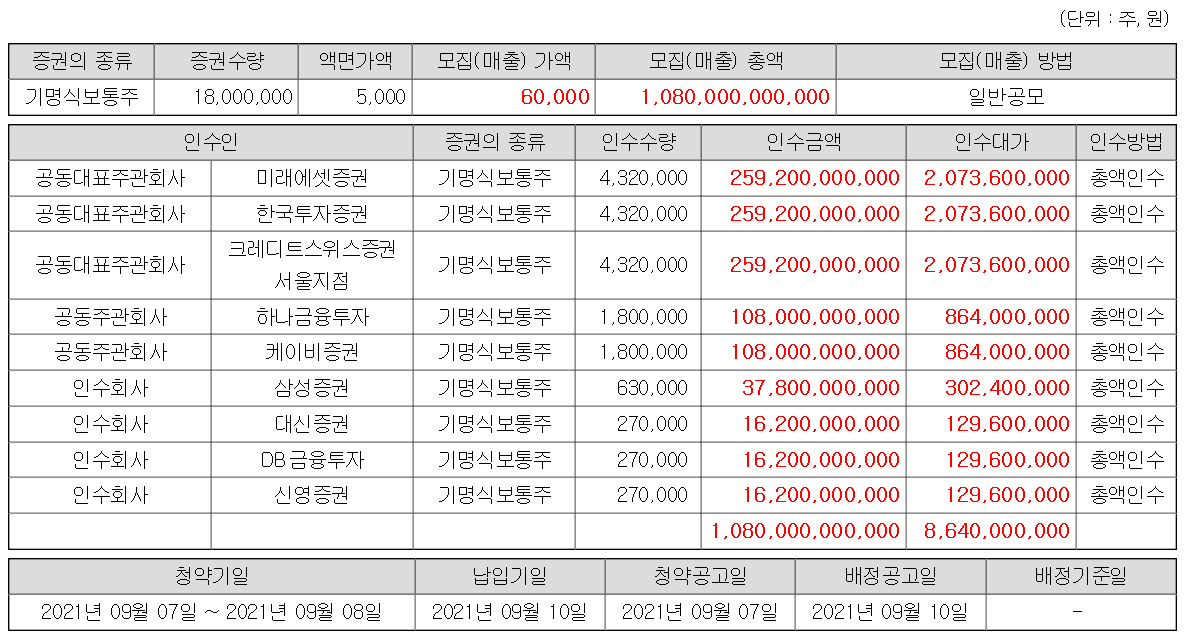 - 공모청약일 : 2021년 09월 07일 ~ 09월 08일