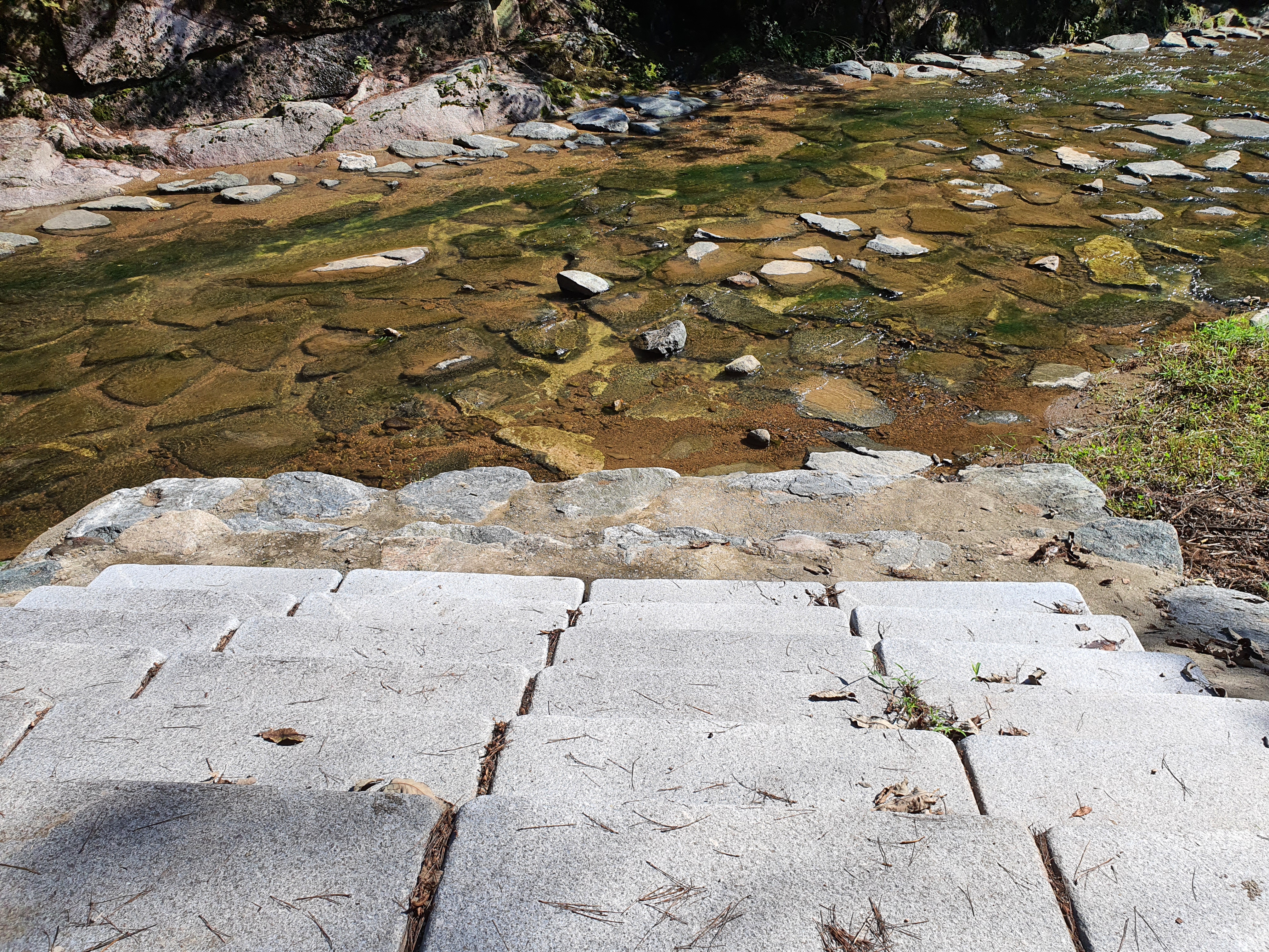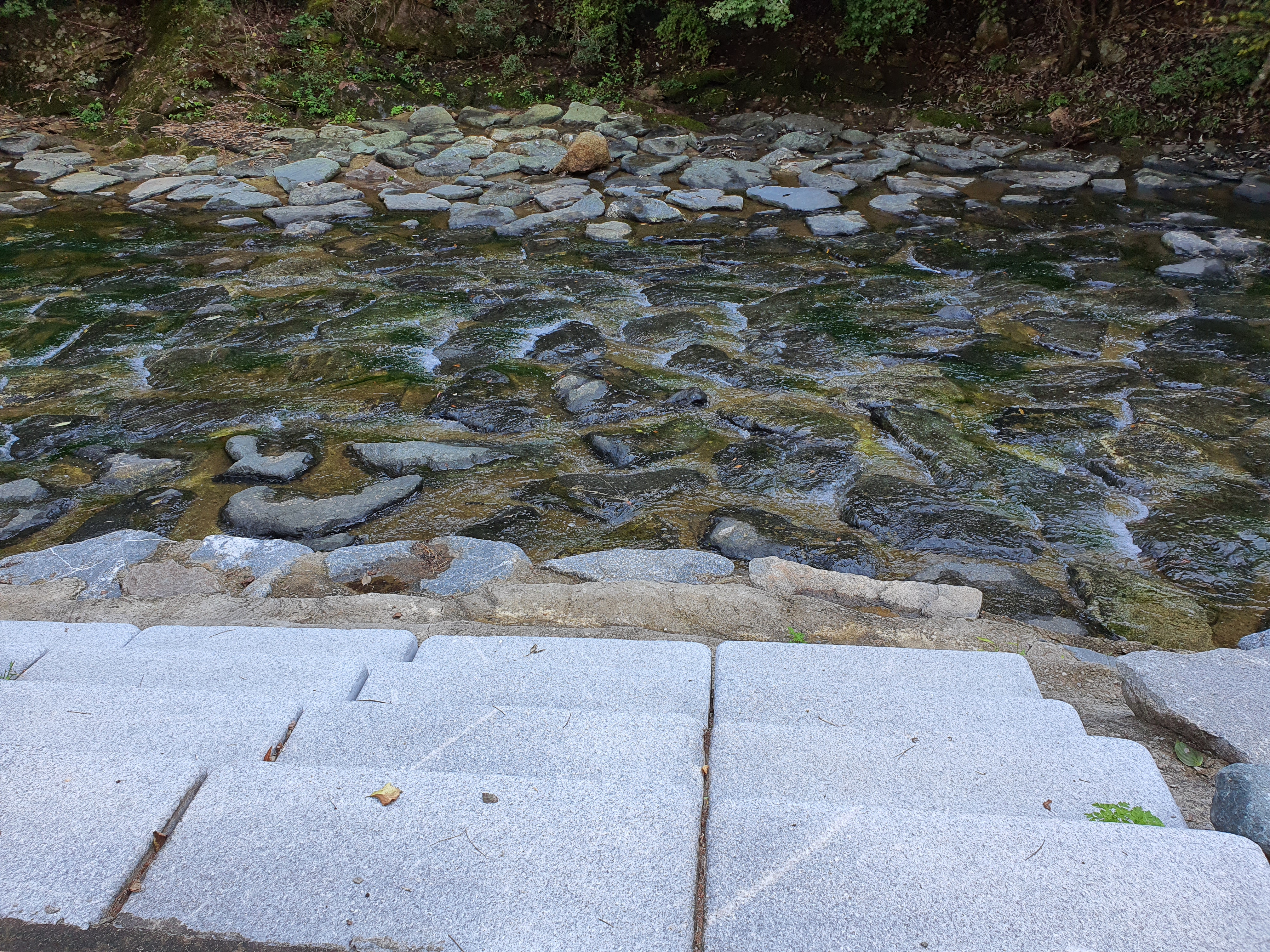 주차장에서 약 3분 정도 올라가면 개울 쪽으로 내려가는 계단을 만들어 두어 손을 담글 수가 있더라고요.