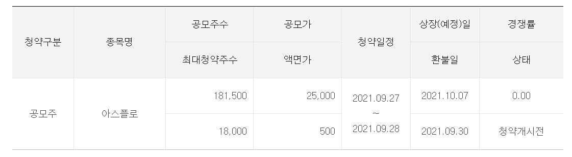 - 아스플로 상장예정일 : 2021년 10월 07일