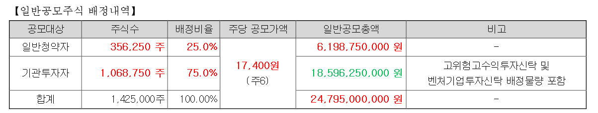 상장 주관사는 삼성증권 단독 주관사이며 이번 일반 공모 주수는 356,250주, 구주매출은 없고 100% 신주를 상장 공모하고 일반공모총액은 24,795백만원 입니다.