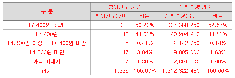 이번 수요예측에서의 의무보유확약률은 4.08%(50곳)으로 1개월 확약이 12곳, 3개월 확약 33곳, 6개월 확약 5곳입니다.