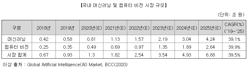 위 표를 보면 국내 머신러닝 및 컴퓨터 비전 시장은 급격히 성장하고 있으며 트윔의 AI기반 머신비전의 적용 분야 역시 기하급수적으로 증가할 것이라 예상하고 있습니다.