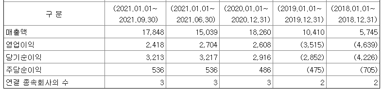 트윔의 요약 재무제표를 보면 2019년까지 영업이익이 적자였으나 2020년부터 흑자로 돌아섰고 2021년은 2020년의 매출 및 영업이익을 넘길 것으로 예상됩니다.