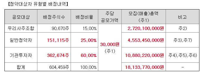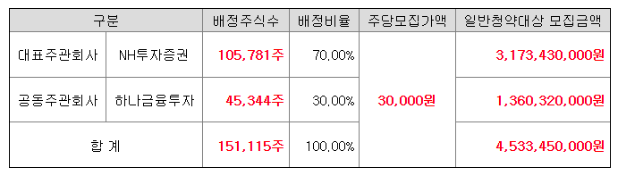 일반 청약자 물량은 총 151,115주인데 NH투자증권 배정주식수가 105,781주, 하나금융투자 배정주식수가 45,344주로 100% 신주모집입니다.