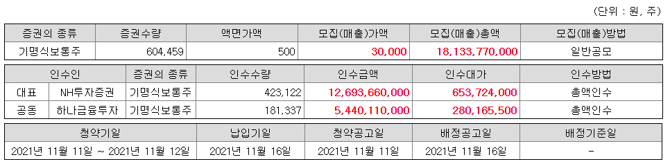 - 공모청약일 : 2021년 11월 11일~2021년 11월 12일