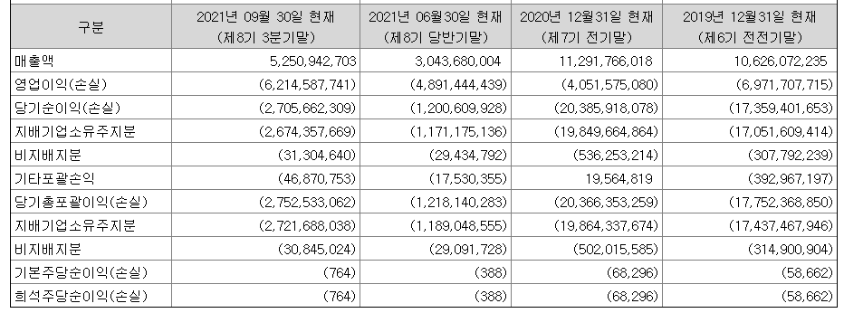 2019년 약 69억, 2020년 약 40억, 2021년 09월 30일까지 62억 원의 적자를 기록하고 있으니 투자하실 때 참고하셔야 할 듯합니다.