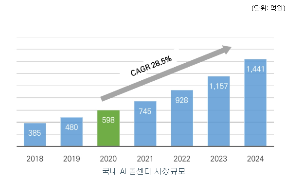2020년 기준 마인즈랩의 가장 높은 매출 비중을 차지하는 AICC분야의 국내 AI콜센터 규모는 2020년 598억 원, 2021년 745억, 2024년까지 1,441억으로 매년 28.5% 성장할 것으로 추정됩니다.